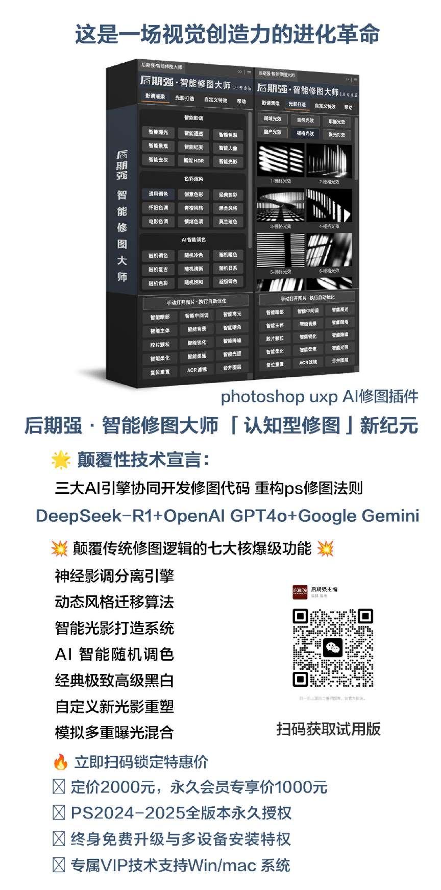 现推出限时优惠:原价2000元,后期强永久会员专享价1000元,包含终身免费升级与多设备安装权限。即刻体验AI修图技术如何将繁琐后期转化为创意迸发的过程,