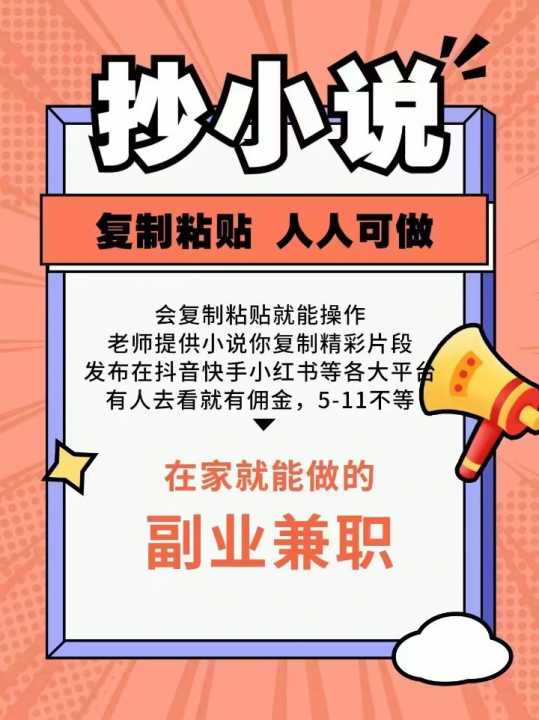 抄小说有手机会复制粘贴就可以!不限时间地点,一天100-300 ,包教会,想利...