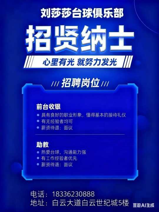 刘莎莎台球俱乐部招前台有无经验均可 招助教数名